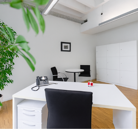 – Ein komplett möblierter Arbeitsplatz inkl. Schreibtisch, Drehstuhl, Telefon und Besprechungs-ecke