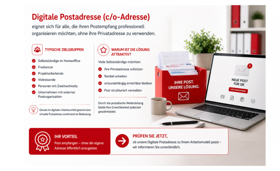 Die Digitale Postadresse (c/o-Adresse) eignet sich für alle, die ihren Postempfang professionell organisieren möchten, ohne ihre Privatadresse zu verwenden.